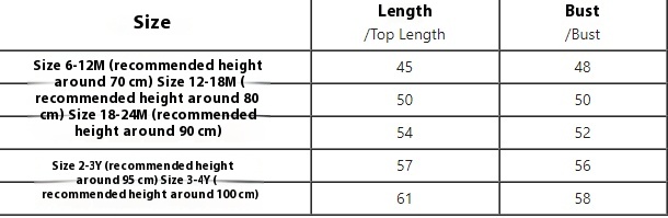 Suitable height: 6-12M size, 12-18M size, 18-24M size, 2-3Y size, 3-4Y size